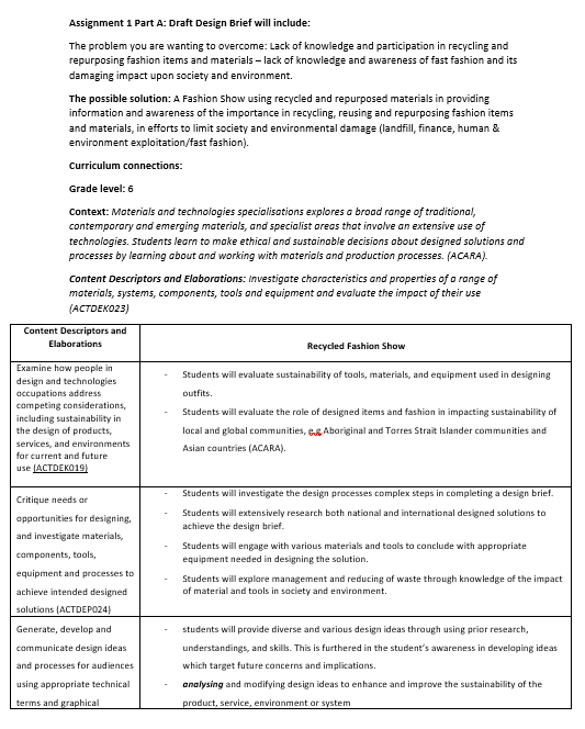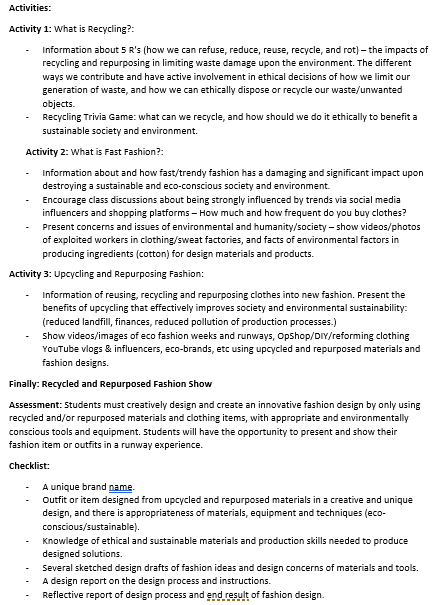 This website provides guidance to Grade 6 students undertaking Digital Technology. By presenting support in the digital technology context of Materials and technologies specialisations through an assignment intended to encourage “ethical and sustainable decisions about designed solutions and processes by learning about and working with materials and production processes” (Australian Curriculum, Assessment and Reporting Authority, 2019). This will be achieved through their assignment presenting the task of creating and designing a recycled and repurposed fashion design for their own class fashion show.